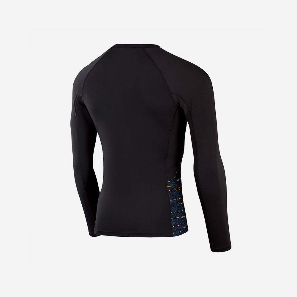Performance swimwear for the outdoors. Designed for active beach days, this streamlined black Long Sleeve Rash Top offers UPF40+ fabric sun protection and includes side panel splices of our velocity-inspired print. Snug-fitting in a pull-on style, it features flat-locked seams for a comfortable fit against the body and a board short loop to connect to board shorts or leggings. Designed to be durable, the top is made from our Endurance+ fabric, which is quick-drying and 100% chlorine resistant. In addition, one of the yarns in this fabric is made from 100% post-consumer waste, such as recycled plastic bottles.
